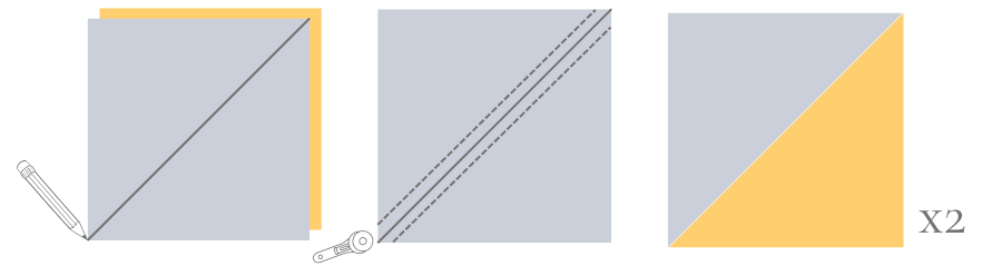 The half square triangle is exactly what it sounds like… two right triangles put together into a square. The most basic way to make this block is by cutting out two squares and placing them on top of each other right sides together (RST). Then draw a line directly down the middle from one corner to the opposing corner.