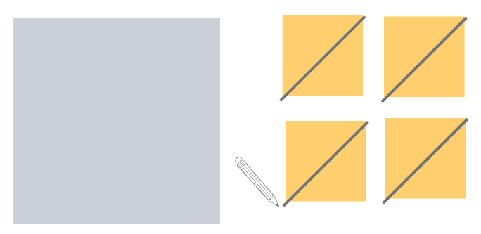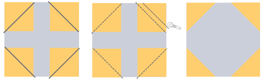This block is often used to represent a circular shape or “rounded” corners in quilting. It consists of one large square and four smaller squares. For example, you might use one 4” square and 4 1.5” squares. Place your large square right side up. Then take your four small squares and draw a diagonal line on the wrong side of each, corner to corner.